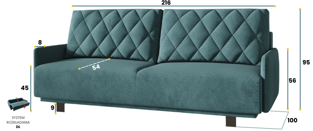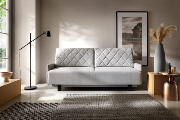 Funkcja spania jest łatwo dostępna dzięki prostemu w obsłudze automatu. Wystarczą tylko dwa ruchy, aby zamienić kanapę w wygodne miejsce do snu. Dodatkowo, kanapa posiada obszerny pojemnik na pościel, co czyni ją praktycznym rozwiązaniem.