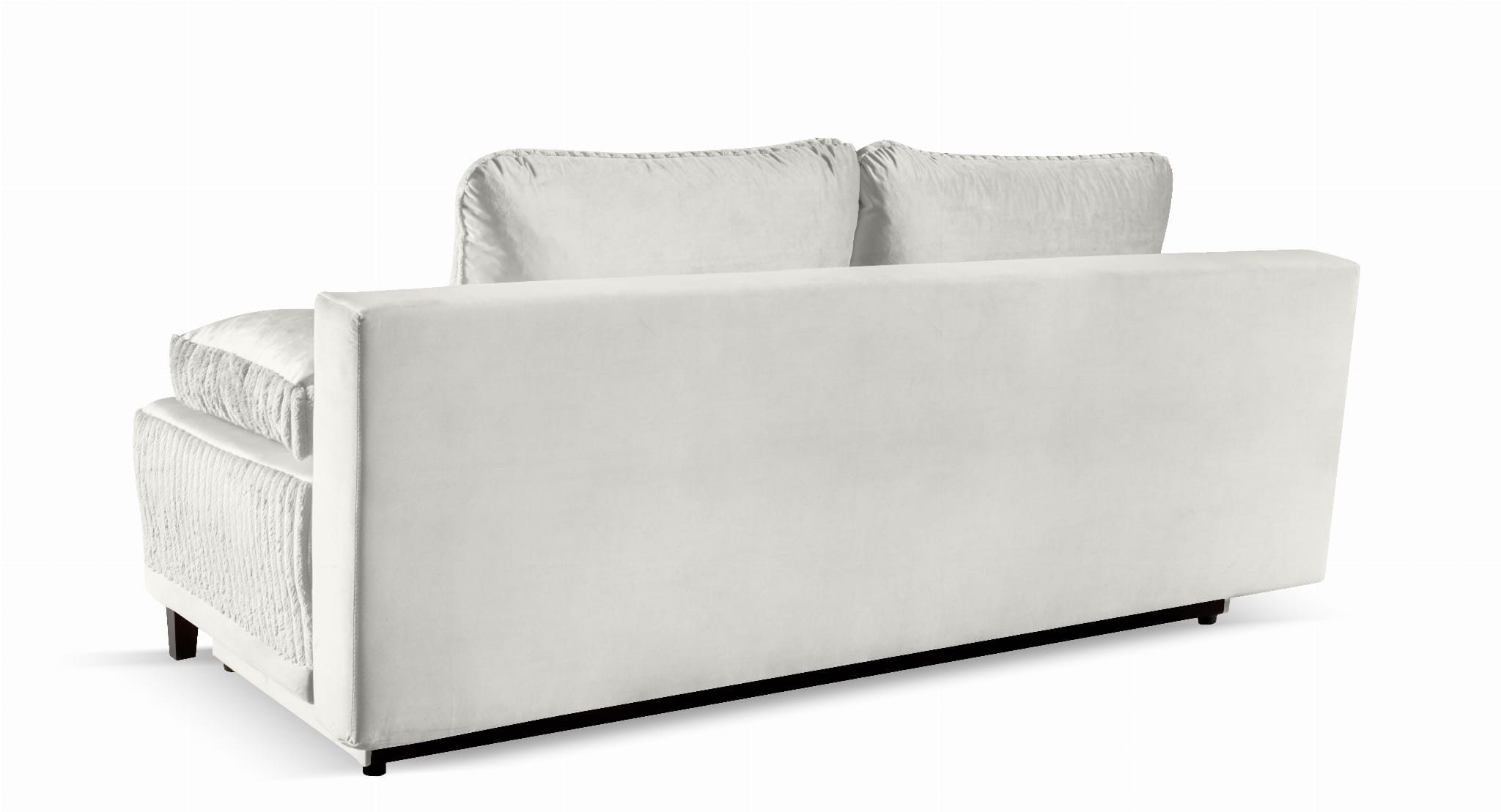 Mebel stoi na solidnych nóżkach z tworzywa, które zapewniają stabilność i trwałość. Tył kanapy obity jest materiałem, dzięki czemu prezentuje się atrakcyjnie nawet wtedy, gdy jest umieszczona na środku salonu.