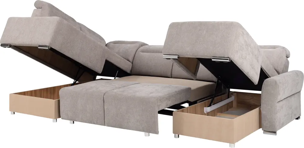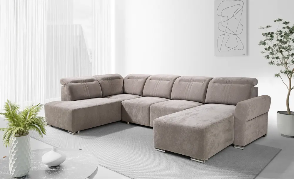 Mechanizm rozkładania Puma umożliwia szybkie i łatwe przekształcenie narożnika w wygodne łóżko. Narożnik lewy, wyposażony w sprężynę i dwa pojemniki na pościel, oferuje praktyczne rozwiązania do przechowywania.