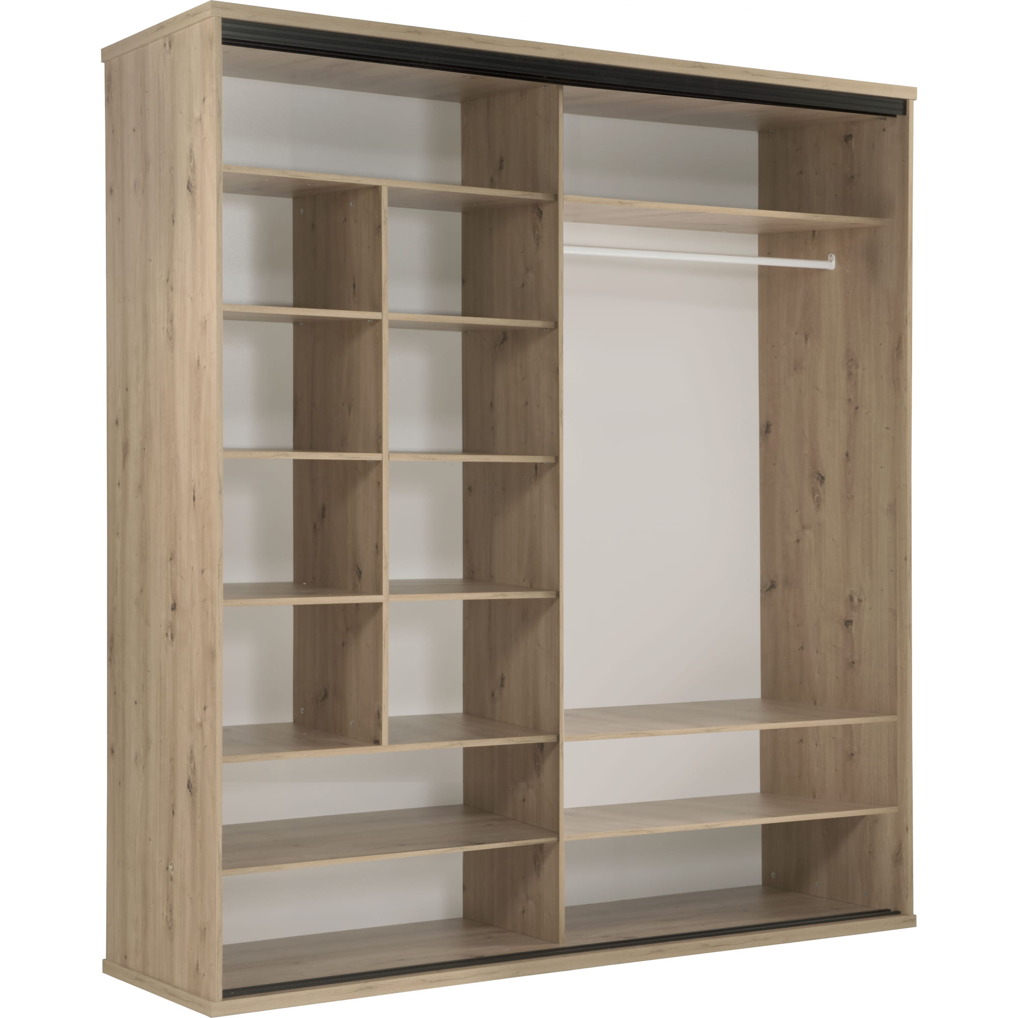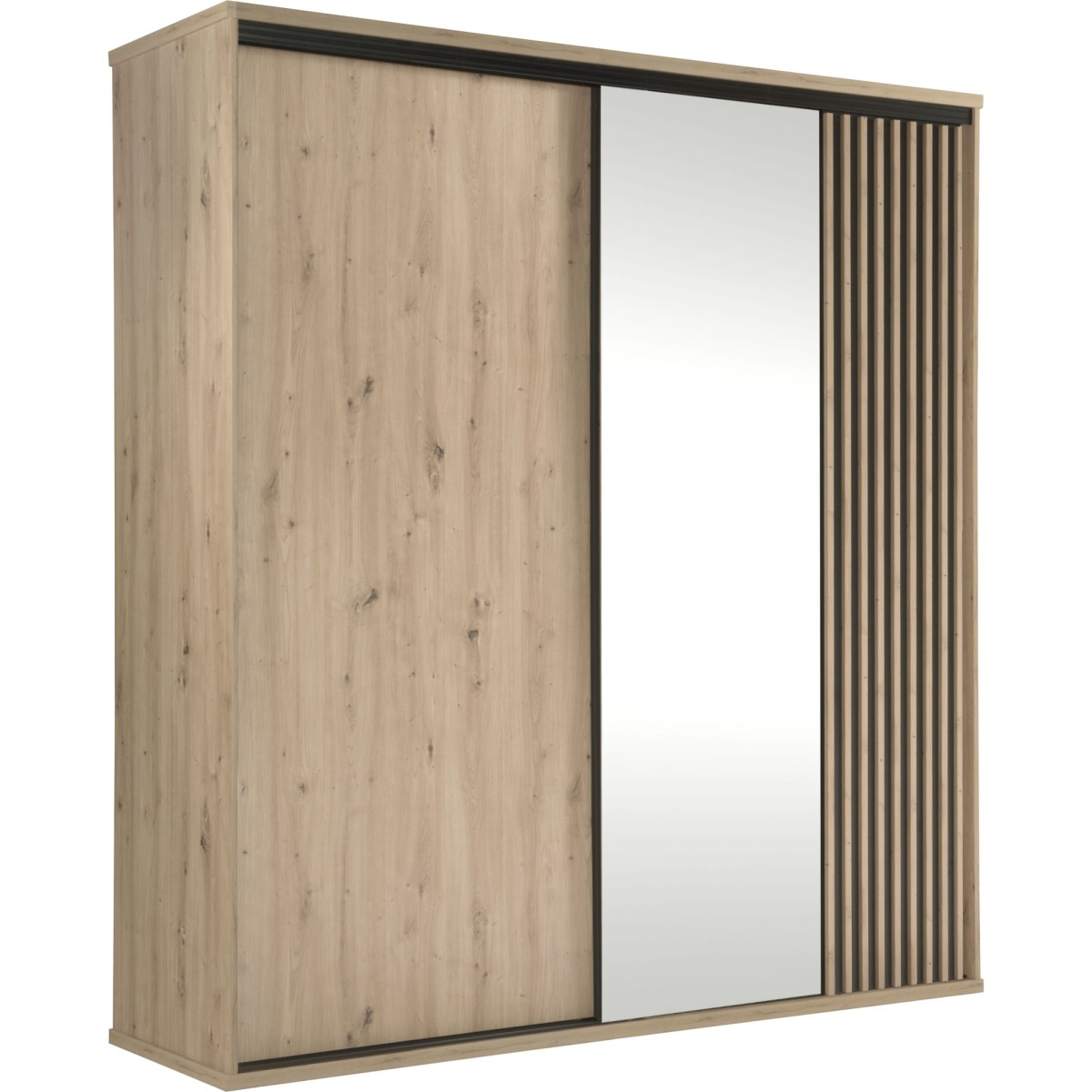 Szafa Cali C-15 harmonizuje i balansuje naturalny odcień Artisan z elementami czarnymi oraz lamelową wstawką. Duże lustro umieszczone na froncie optycznie powiększa przestrzeń.