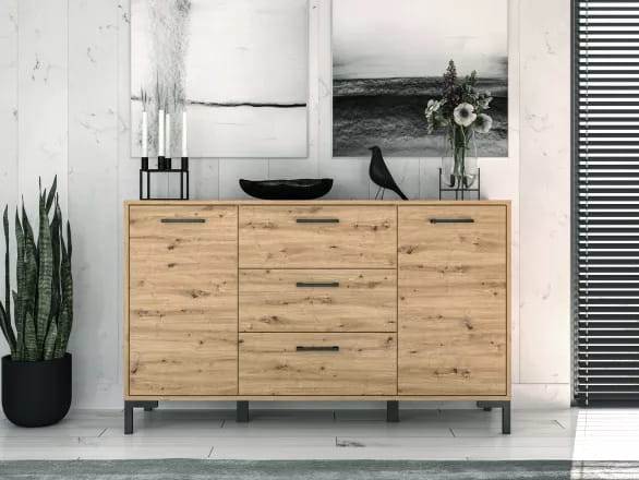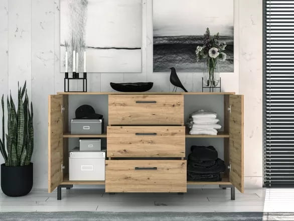 Komoda to wielofunkcyjny i praktyczny mebel. Może służyć jako schowek i jednocześnie jako element dekoracyjny. Ustaw ją w salonie lub jadalni, gdzie połączysz ją z różnym wyposażeniem. Jeśli dobrze dobierzesz do niej pozostałe elementy, stworzysz cały zestaw eleganckich mebli. Ta komoda jest bardzo wszechstronna. Niezależnie od tego, czy stanie w sypialni, w przedpokoju, pokoju dziecięcym, czy w salonie zawsze możesz w niej pomieścić niezbędne rzeczy i poustawiać na niej ozdoby, ramki do zdjęć, kwiaty i rośliny. Jeśli chcesz, może też pełnić funkcję stolika nocnego przy łóżku. U nas kupisz komodę, która pasuje zarówno do nowoczesnych, jak i klasycznych wnętrz. Wysokiej jakości surowiec, który użyto do jej wykonania, sprawia, że będzie to mebel, który posłuży Ci lata.