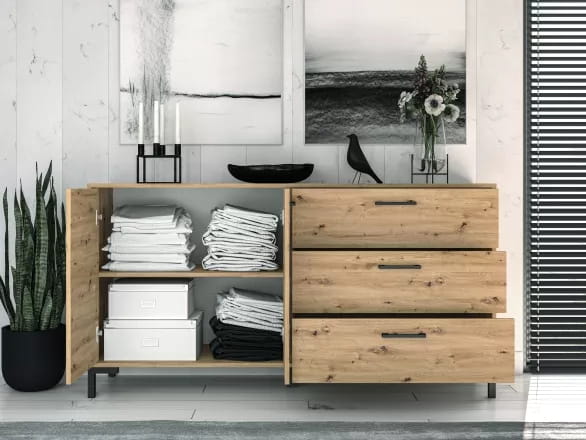 Komoda to wielofunkcyjny i praktyczny mebel. Może służyć jako schowek i jednocześnie jako element dekoracyjny. Ustaw ją w salonie lub jadalni, gdzie połączysz ją z różnym wyposażeniem. Jeśli dobrze dobierzesz do niej pozostałe elementy, stworzysz cały zestaw eleganckich mebli. Ta komoda jest bardzo wszechstronna. Niezależnie od tego, czy stanie w sypialni, w przedpokoju, pokoju dziecięcym, czy w salonie zawsze możesz w niej pomieścić niezbędne rzeczy i poustawiać na niej ozdoby, ramki do zdjęć, kwiaty i rośliny. Jeśli chcesz, może też pełnić funkcję stolika nocnego przy łóżku. U nas kupisz komodę, która pasuje zarówno do nowoczesnych, jak i klasycznych wnętrz. Wysokiej jakości surowiec, który użyto do jej wykonania, sprawia, że będzie to mebel, który posłuży Ci lata.