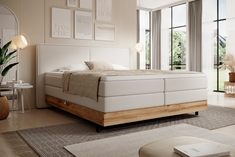 Łóżko kontynentalne Nebia to elegancka propozycja o minimalistycznej formie, która wnosi do sypialni subtelny szyk i ciepło naturalnego drewna.