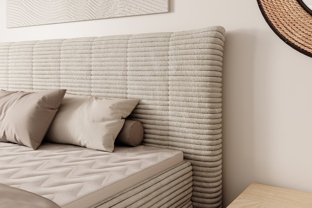 Klasyczne wezgłowie z licznymi pionowymi przeszyciami dodaje bryle szyku i świetnie komponuje się zarówno z nowoczesnymi, jak i bardziej tradycyjnymi aranżacjami.