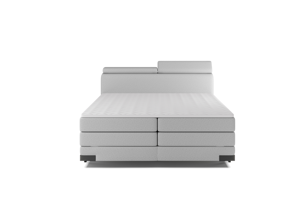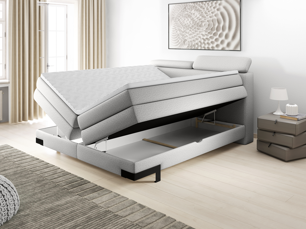 Model wyróżnia się podwójnym pojemnikiem na pościel ułatwiającym przechowywanie oraz praktyczną funkcją relax w zagłówku, która umożliwia wygodną pozycję półleżącą podczas czytania czy odpoczynku.