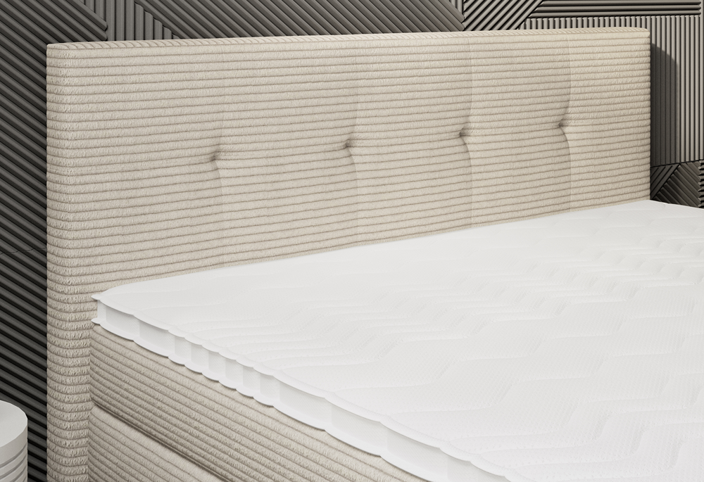 Komfort wypoczynku zapewnia duet materacy: wytrzymały materac bonellowy w dolnej części oraz materac kieszeniowy 7‑strefowy na wierzchu, który precyzyjnie wspiera sylwetkę. System ten gwarantuje sprężyste podparcie i równomierny relaks przez całą noc.