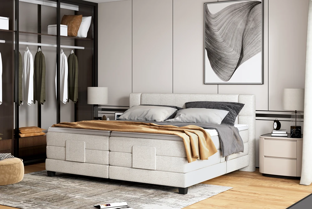 Kluczową zaletą modelu jest elektryczna regulacja pozycji spania, umożliwiająca łatwe dostosowanie kąta nachylenia do osobistych preferencji – idealne do wieczornego relaksu, czytania czy wygodnego wstawania.