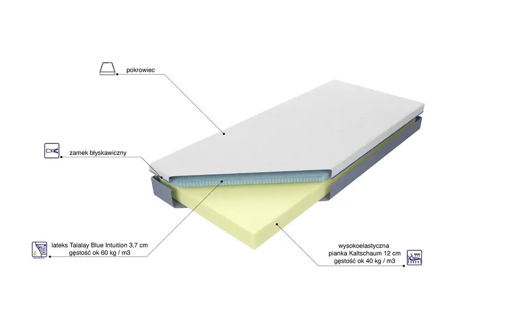 Lateks Talalay Blue Intuition. Zastosowany lateks Talalay Blue Intuition posiada zdolność do utrzymywania równowagi cieplnej. Odpowiednio absorbuje lub oddaje energię w zależności od zmieniającej się temperatury ciała, co eliminuje problem potliwości. Otwartokomórkowa struktura lateksu podnosi poziom cyrkulacji powietrza, co sprzyja komfortowi i higienie snu.