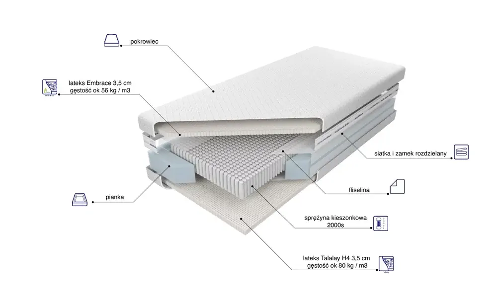 Materac ten charakteryzuje się wysokością około 21 cm i opiera się na zaawansowanej technologii sprężyn 2000S z wysokogatunkowego drutu, umieszczonych w pojedynczych kieszonkach o średnicy 25 mm. Ta innowacyjna konstrukcja zapewnia znaczną elastyczność materaca oraz zwiększone punktowe podparcie ciała, co przekłada się na doskonały sen.