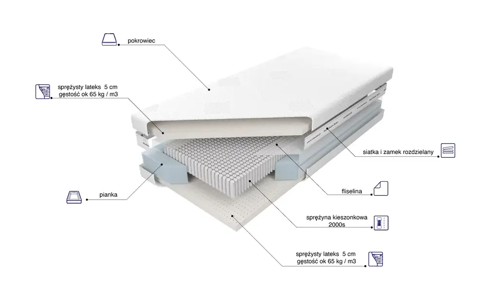 Materac ten ma imponującą wysokość około 24 cm i opiera się na zaawansowanej technologii sprężyn 2000S z wysokogatunkowego drutu, umieszczonych w pojedynczych kieszonkach o średnicy 25 mm. Ta innowacyjna konstrukcja zapewnia nie tylko znaczną elastyczność materaca, ale także zwiększone punktowe podparcie ciała, co przekłada się na wyjątkowy komfort snu.