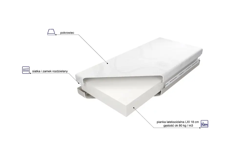 Pianka lateksoidalna. Materac wykonany jest z pianki lateksoidalnej, która charakteryzuje się dużą elastycznością punktową. Dzięki temu materac doskonale dopasowuje się do budowy anatomicznej użytkownika, zapewniając optymalne podparcie dla kręgosłupa.