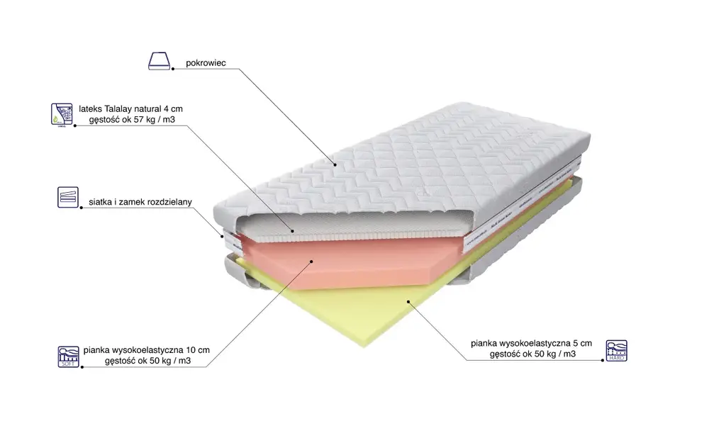 Lateks Talalay Natural. Materac zawiera 4 cm warstwę lateksu Talalay Natural, który posiada otwartokomórkową strukturę, przyczyniającą się do doskonałej wentylacji i cyrkulacji powietrza. Zapewnia to komfortowy sen oraz optymalne podparcie głowy, szyi i ramion.