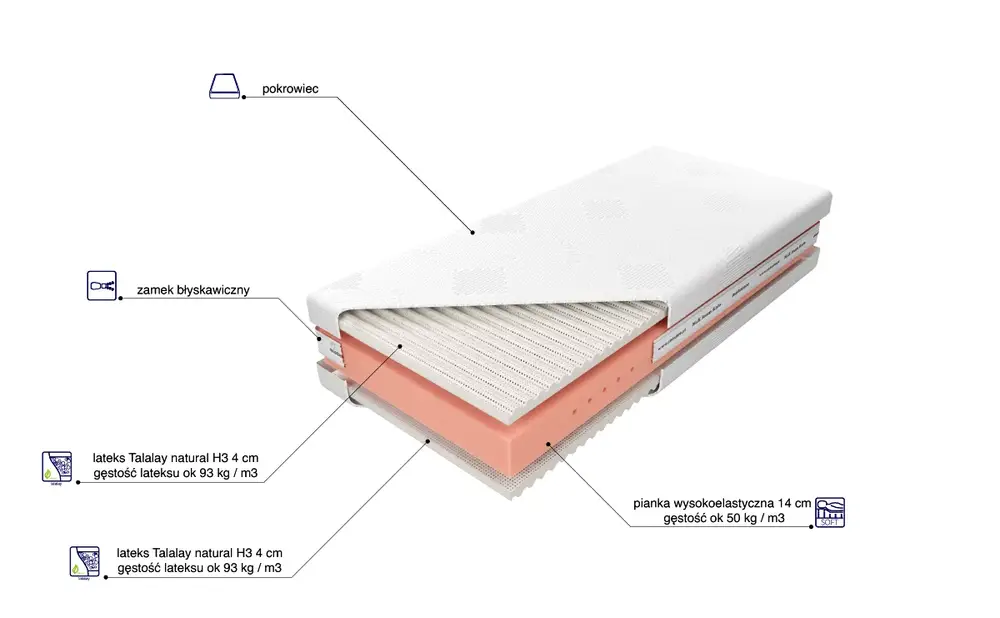 Zamek błyskawiczny. Utrzymanie wysokiego poziomu czystości zapewnia zamek błyskawiczny, który umożliwia łatwe zdjęcie pokrowca. Dzięki temu materac można regularnie czyścić i konserwować, co przyczynia się do utrzymania higieny snu.