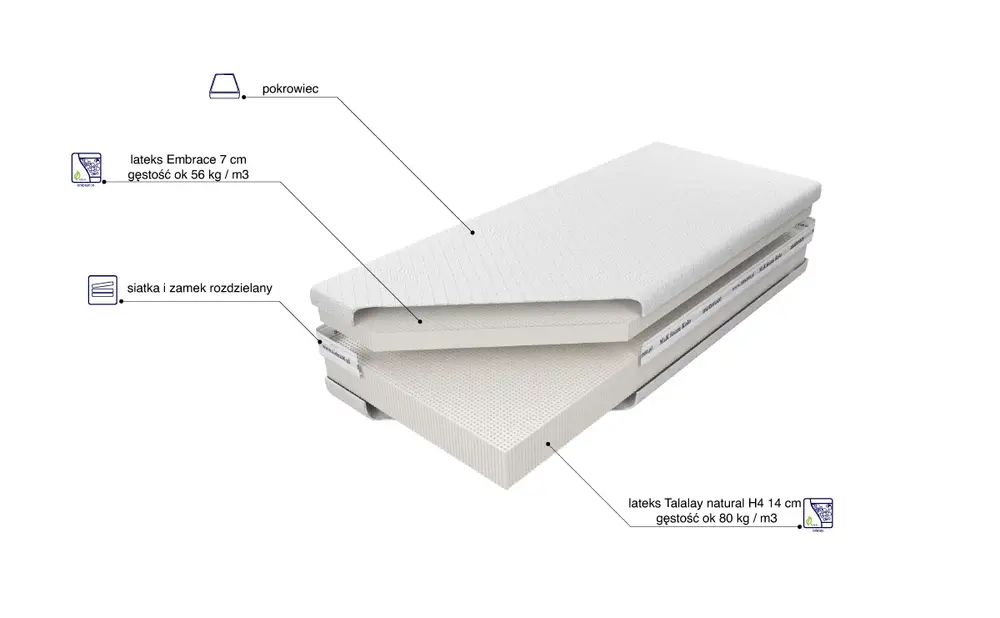 Warstwa lateksu Talalay Embrace. Pierwsza warstwa to 7 cm niezwykle elastycznego lateksu Talalay Embrace. Lateks Talalay Embrace łączy zalety lateksu Talalay i pianki termoelastycznej, co gwarantuje doskonałe dopasowanie do kształtu ciała i amortyzację. Ma właściwości regulujące temperaturę, dzięki czemu materac pomaga utrzymać komfortową temperaturę podczas snu. Otwartokomórkowa struktura tej warstwy zapewnia wysoką cyrkulację powietrza, co zwiększa komfort użytkowania i zapobiega przegrzewaniu.