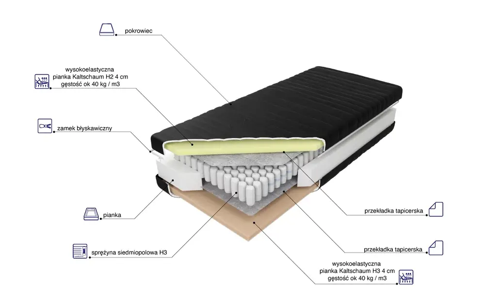 Przekładka tapicerska. Obustronnie użyta przekładka tapicerska doskonale izoluje materac, zwiększa jego twardość i wydłuża żywotność produktu.
