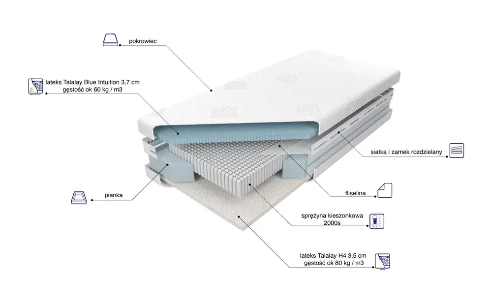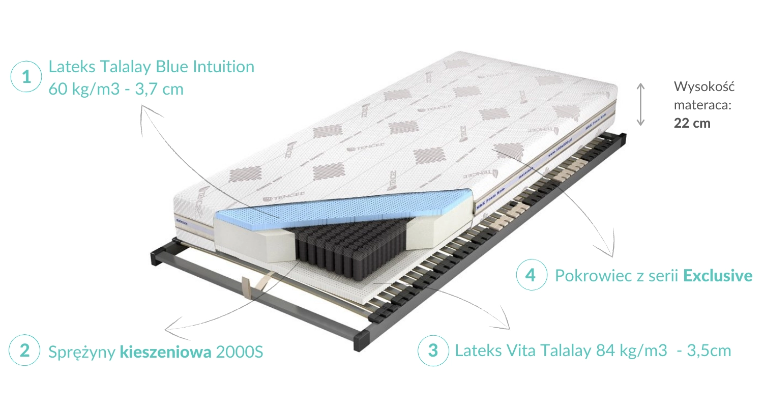 Z jednej strony materaca zastosowana została warstwa lateksu Talalay Blue Intuition o grubości 3,7 cm. Ten specjalny rodzaj lateksu posiada zdolność do utrzymania równowagi cieplnej, co eliminuje problem z potliwością. Jego otwartokomórkowa struktura podnosi również poziom cyrkulacji powietrza w materacu, zapewniając optymalne podparcie i komfort.