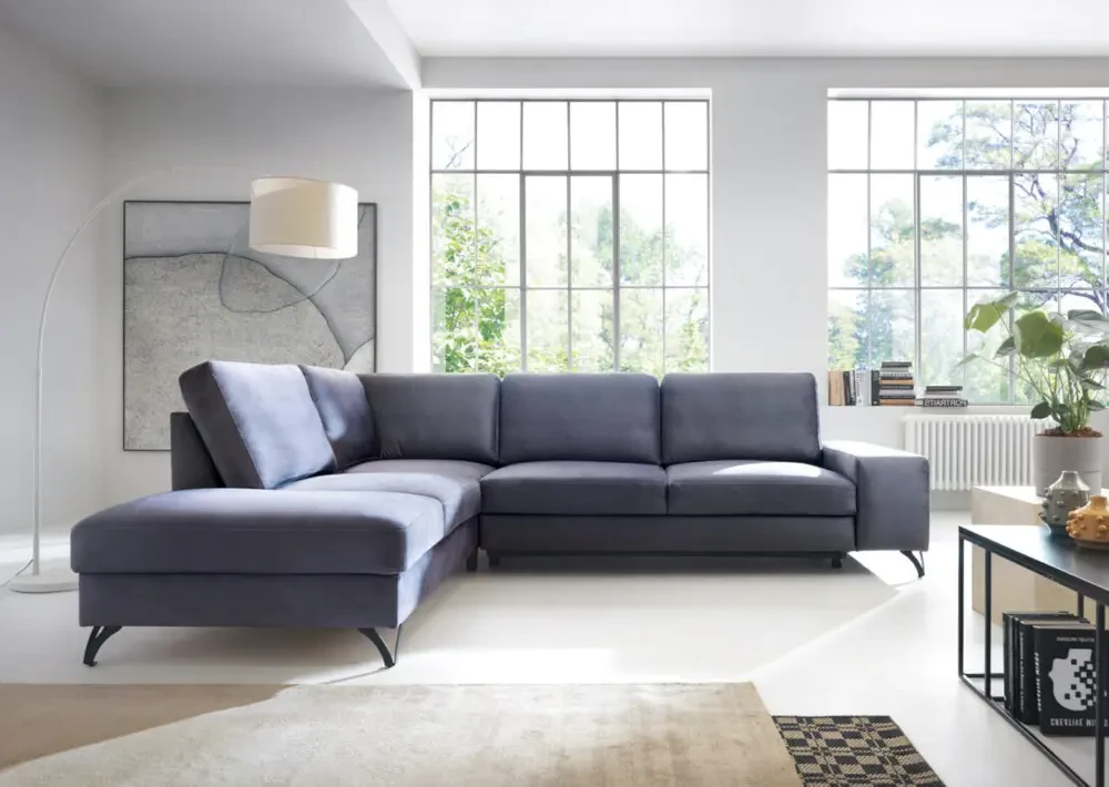 Gdy szuflada zostaje wysunięta, specjalny uchwyt pozwala na wyciągnięcie wewnętrznego materaca, który idealnie dopasowuje się do powierzchni siedziska. Narożnik z funkcją spania typu delfin oferuje wyjątkowy komfort i stabilność podczas snu.