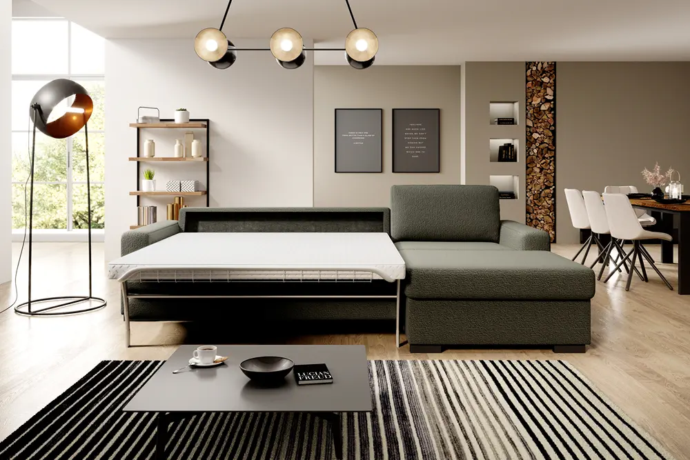 Ten narożnik o minimalistycznej formie został zaprojektowany tak, aby idealnie współgrał z charakterem wnętrza. Dzięki włoskiemu systemowi rozkładania jednym ruchem może być łatwo przekształcony w wygodne łóżko. Jego prosty, ale zarazem efektowny design sprawia, że będzie idealnym wyborem dla użytkowników ceniących funkcjonalność i wygodę.