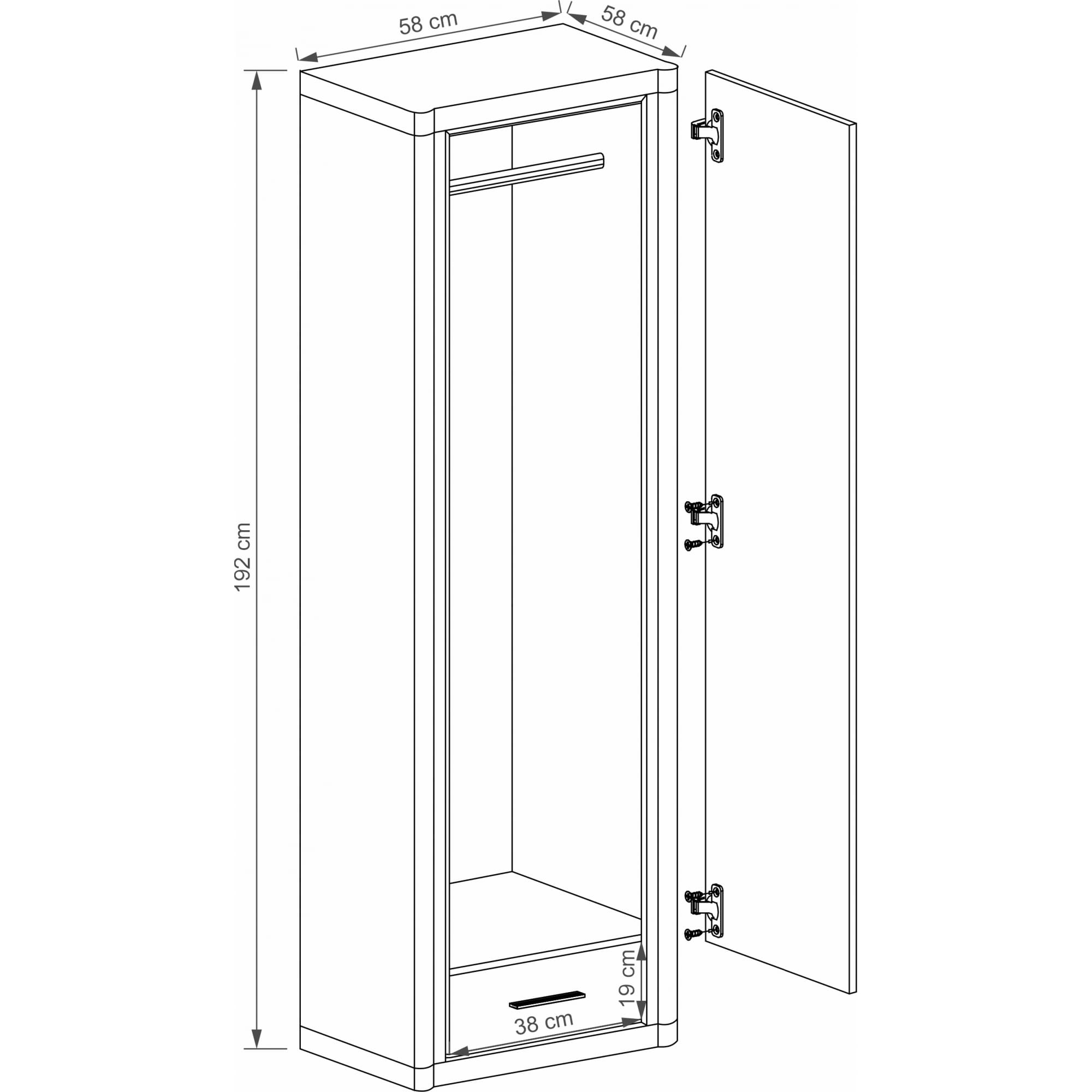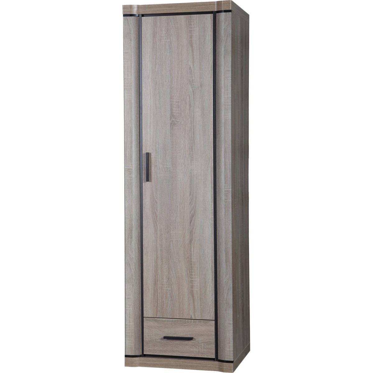 Prosta szafa z kolekcji Dallas, wyposażona w jedną szufladę oraz szafkę z drążkiem, to mebel, który umożliwi praktyczne zagospodarowanie przestrzeni. Metalowe uchwyty doskonale współgrają z czarnymi wstawkami w formie listew, dodając meblowi elegancji i szyku.