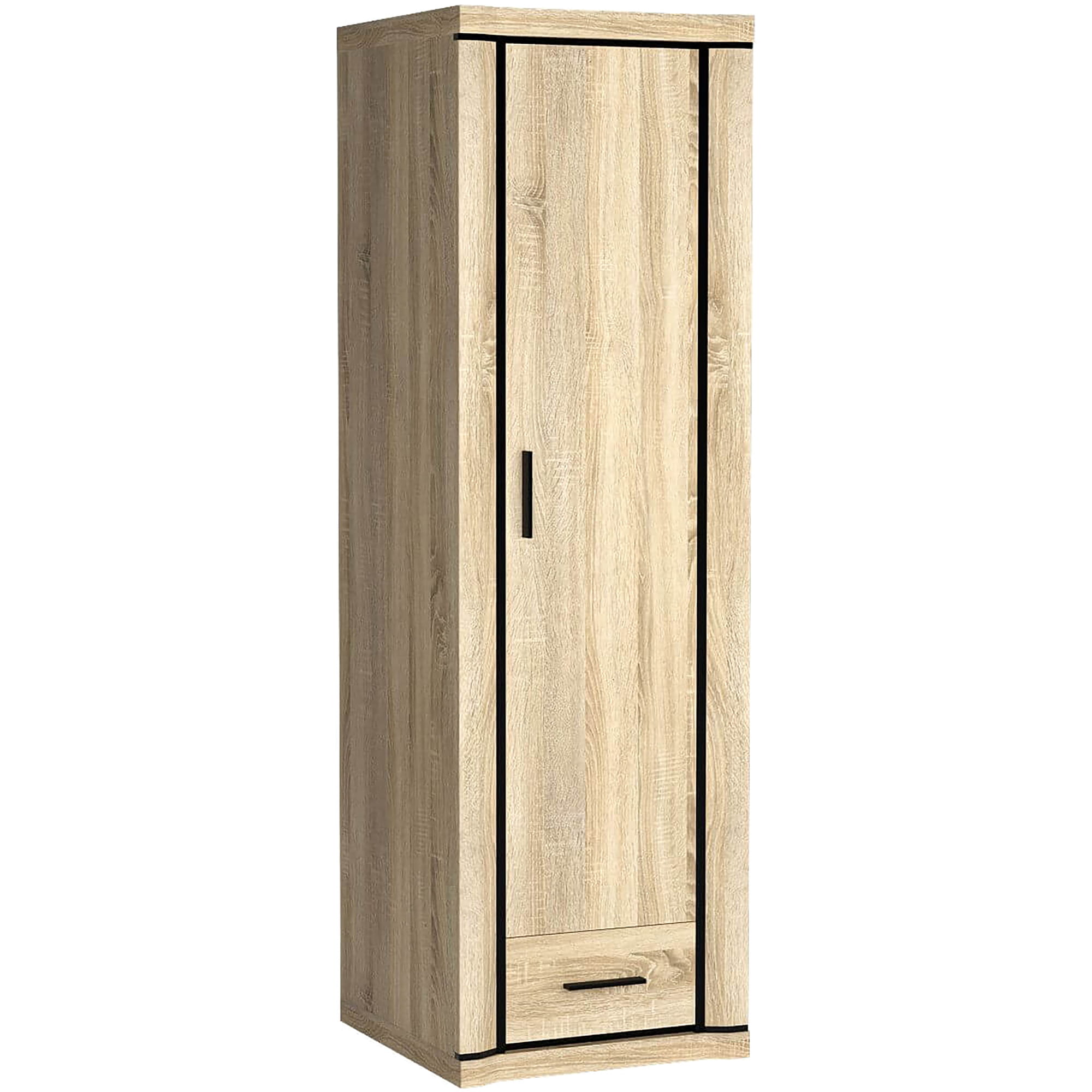 Prosta szafa z kolekcji Dallas, wyposażona w jedną szufladę oraz szafkę z drążkiem, to mebel, który umożliwi praktyczne zagospodarowanie przestrzeni. Metalowe uchwyty doskonale współgrają z czarnymi wstawkami w formie listew, dodając meblowi elegancji i szyku.