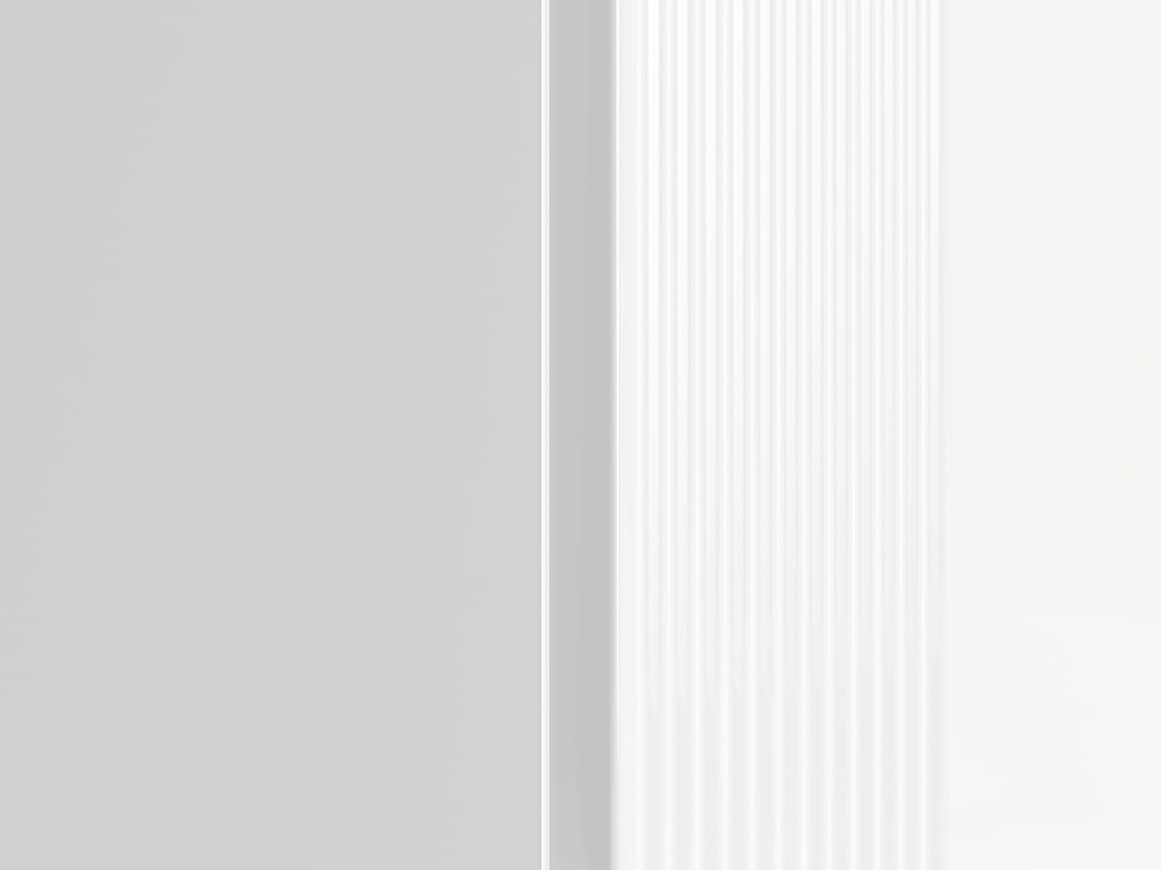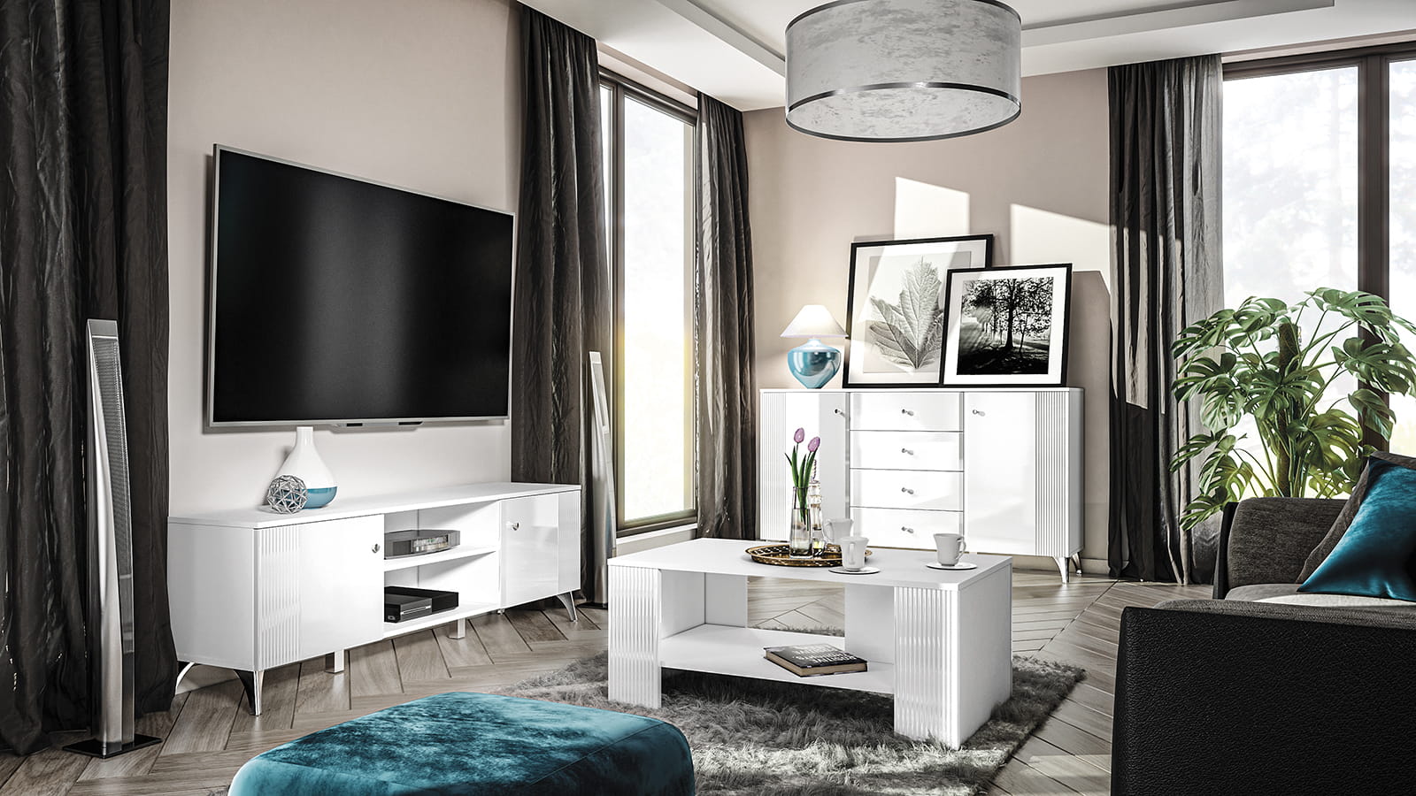 Połyskujące fronty z białego MDF z dekoracyjnymi frezowaniami nadają meblowi ekskluzywny charakter i optycznie powiększają przestrzeń.