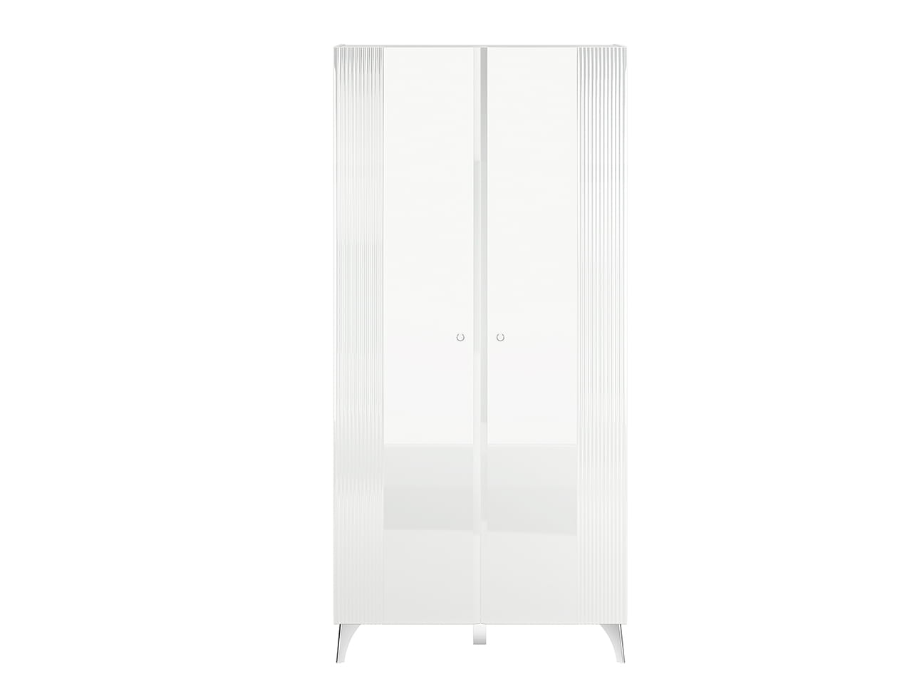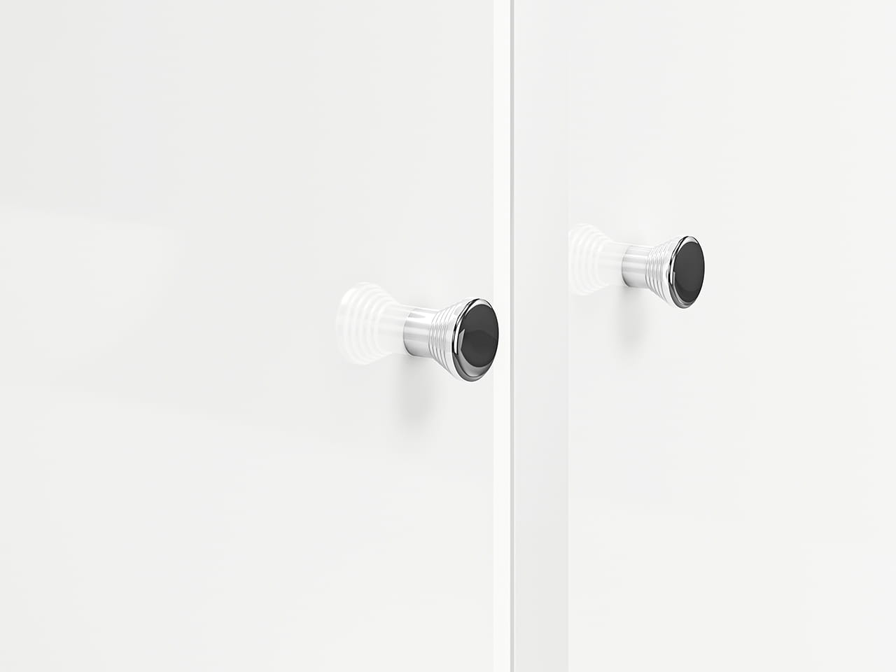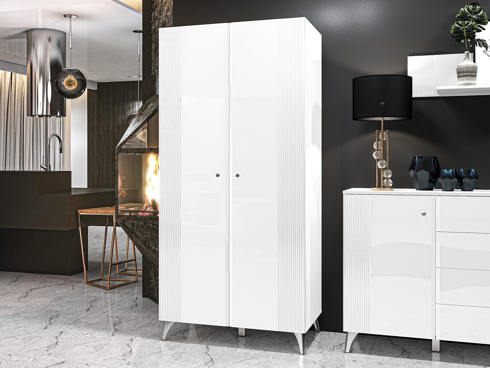 Chromowane, stalowe nóżki oraz uchwyty w identycznym wykończeniu tworzą spójną, harmonijną całość, podkreślając prestiżowy wygląd szafy.