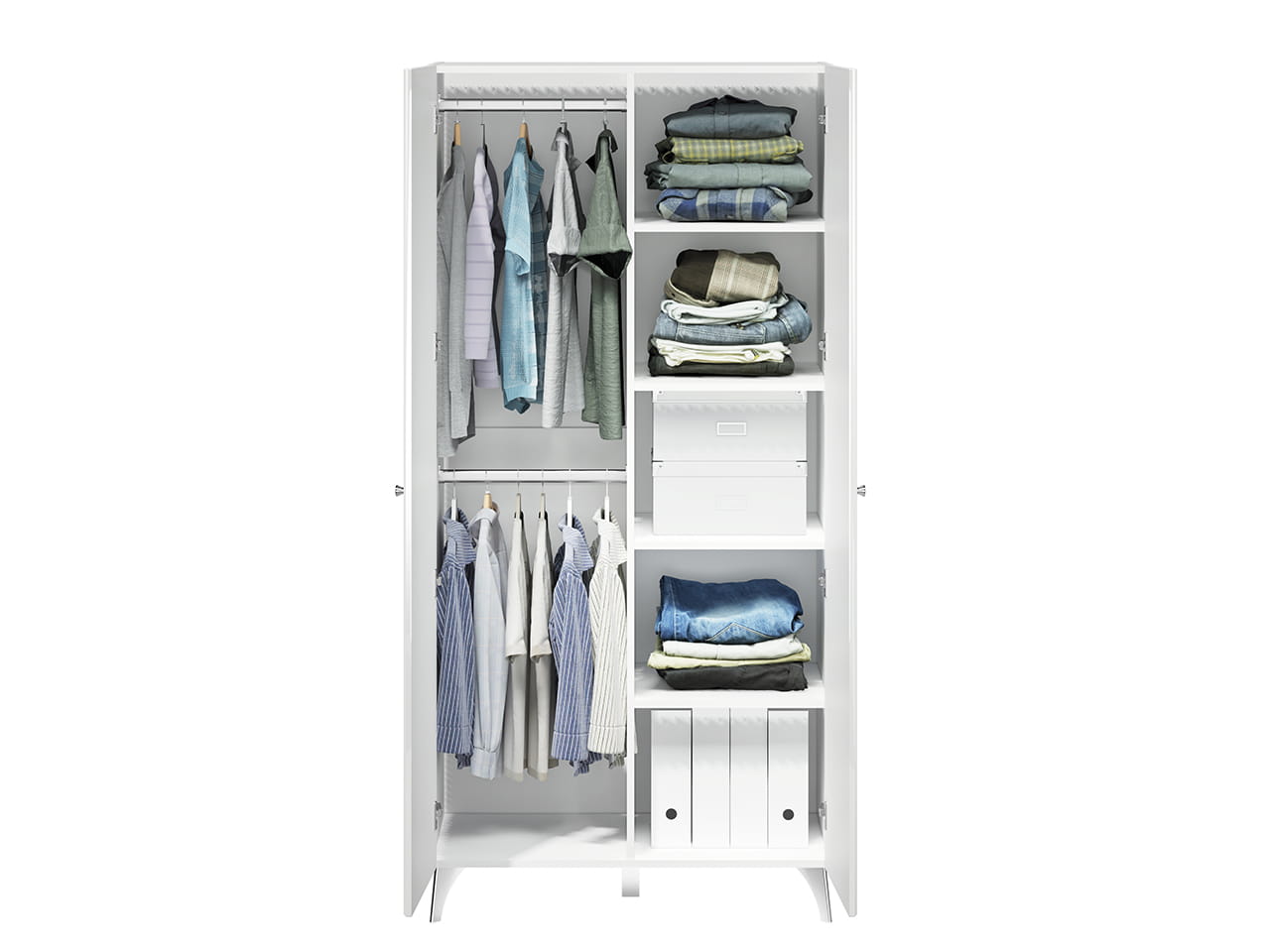 Przemyślany układ wnętrza – drążki na ubrania w lewej części i pojemne półki po prawej – pozwala na wygodne przechowywanie zarówno odzieży wiszącej, jak i złożonej.