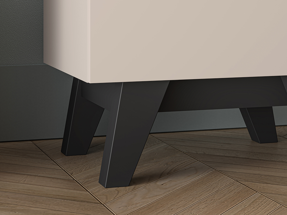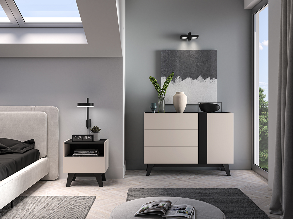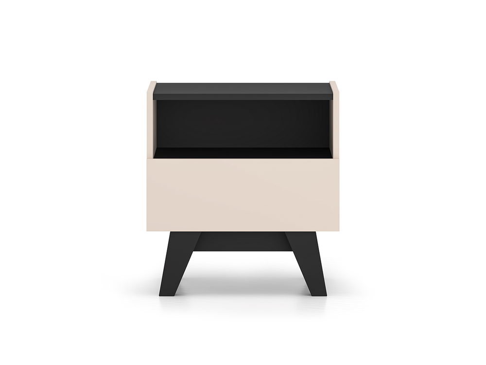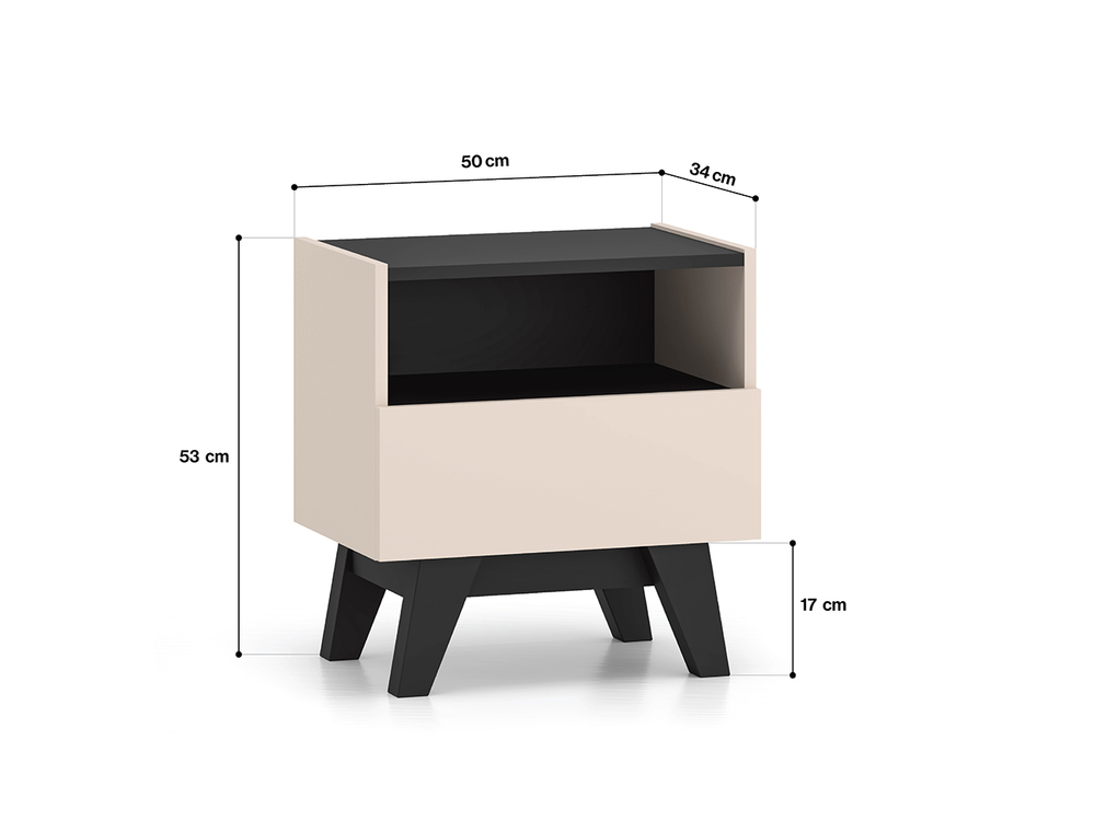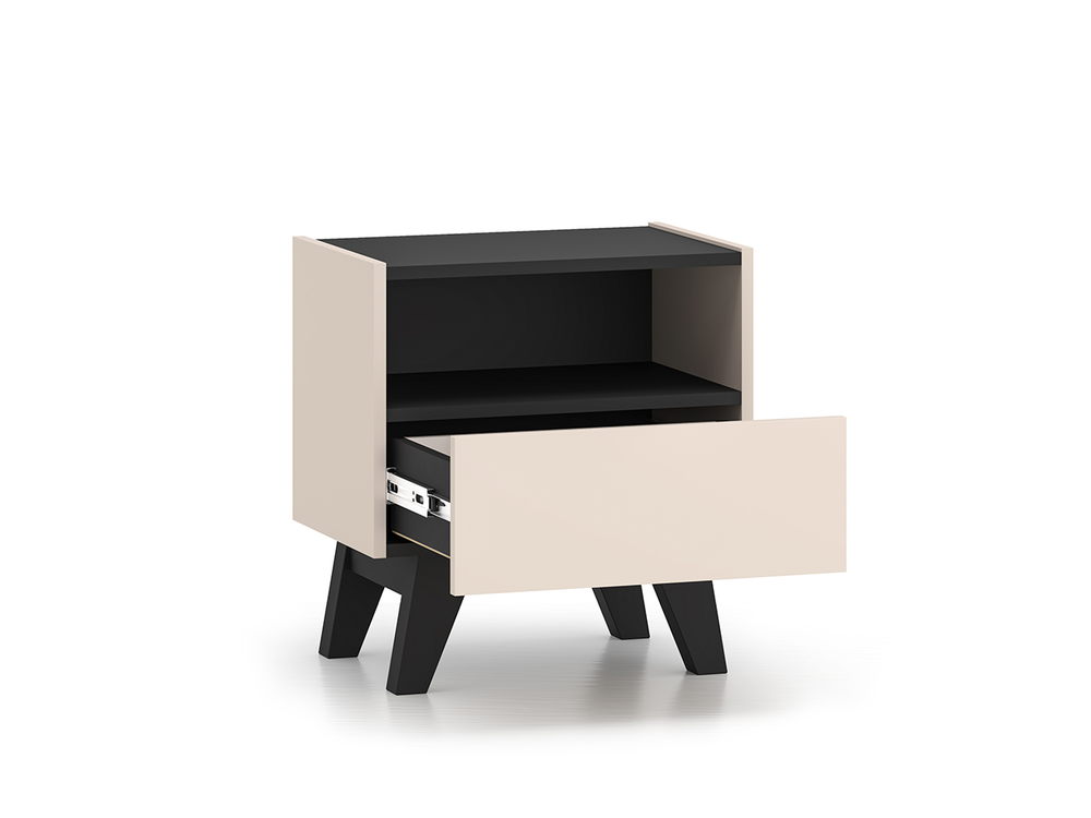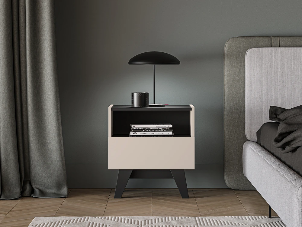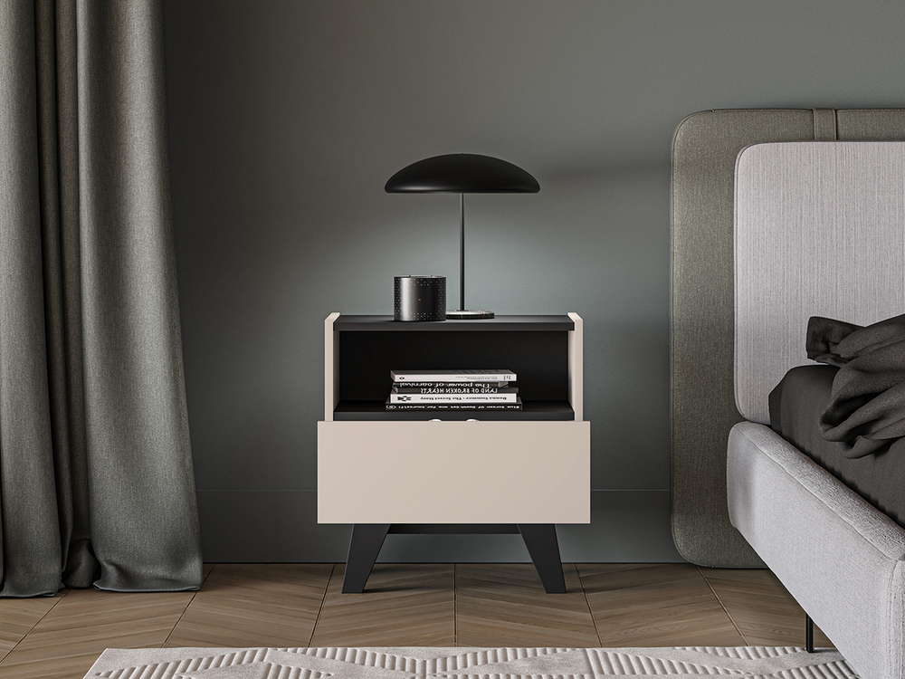 Szafka nocna Freshion 06 w modnym połączeniu kaszmirowego koloru z czarnymi akcentami doskonale wpisuje się w nowoczesne aranżacje sypialni, łącząc elegancję z praktycznością. To idealny wybór dla osób ceniących funkcjonalność, trwałość i stylowy design.