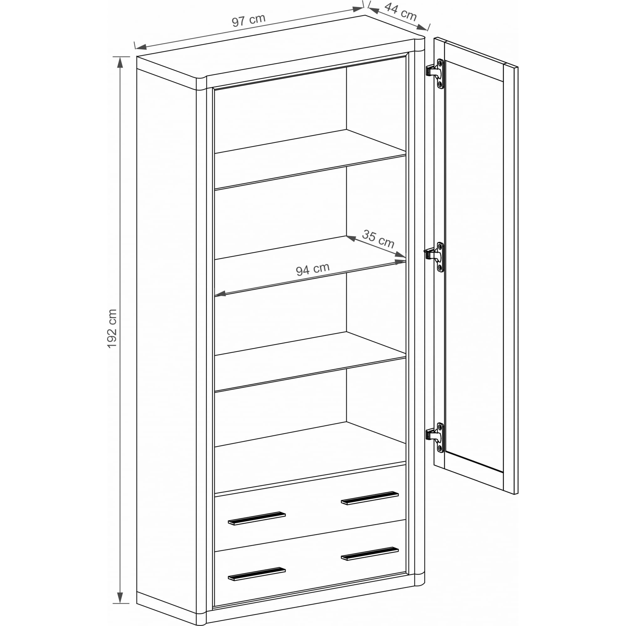 Dodatkowo witryna Dallas D-17 wyposażona jest w dwie praktyczne szuflady. Całość dopełniają oryginalne czarne listwy oraz metalowe uchwyty, które nadają jej niepowtarzalnego wyglądu i przyciągają wzrok. Dostępna w dwóch wersjach kolorystycznych.