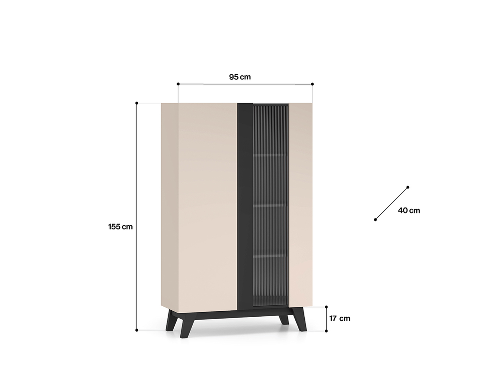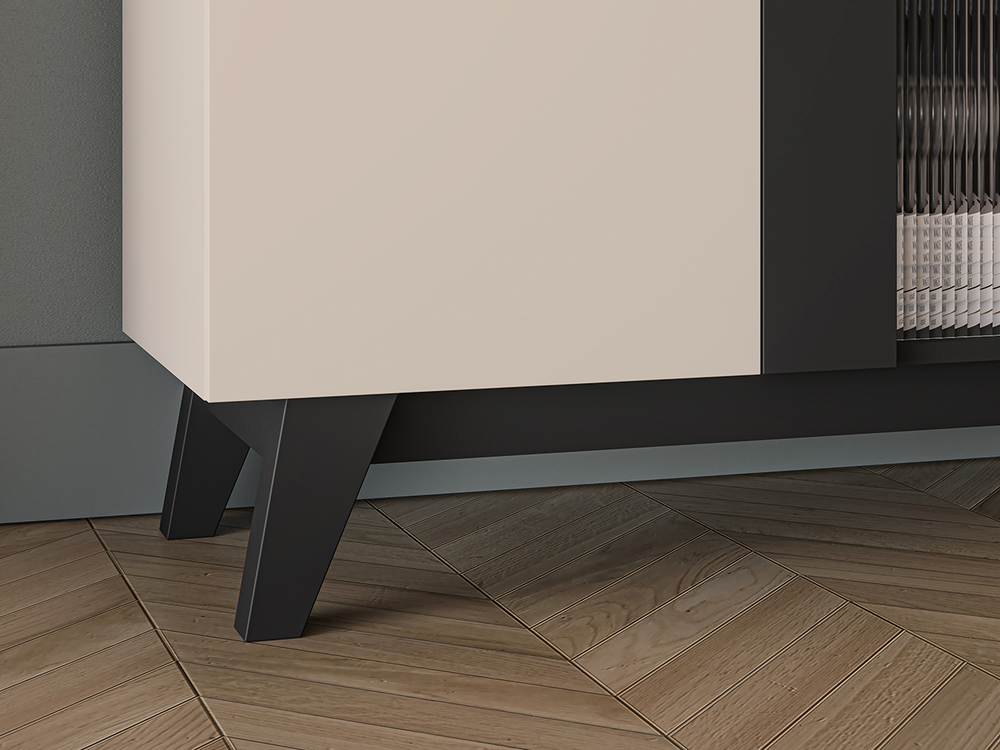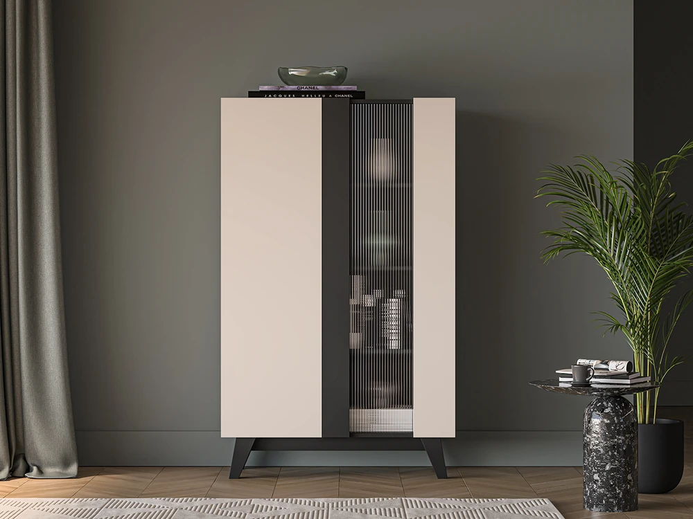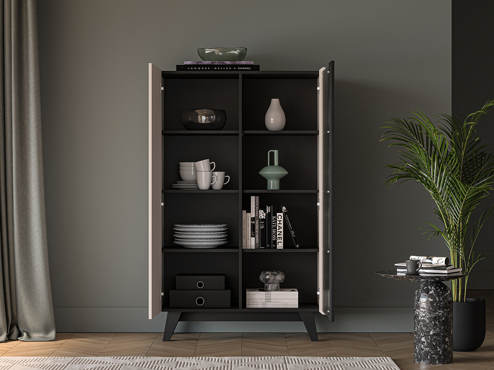 Witryna Freshion 02 w kolorze kaszmirowym z czarnymi akcentami doskonale wpisuje się w nowoczesne aranżacje salonu czy jadalni, zapewniając nie tylko miejsce do przechowywania, ale również wyjątkową dekorację wnętrza.