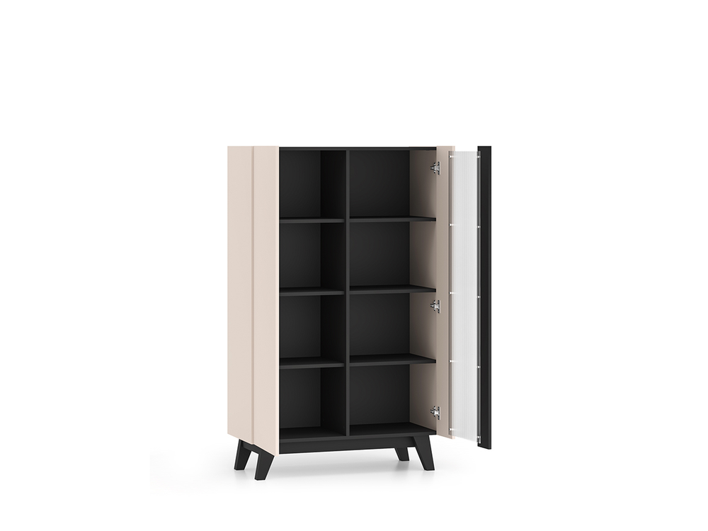 Witryna Freshion 02 to połączenie funkcjonalności i nowoczesnego designu, które pozwoli Ci zarówno przechowywać, jak i efektownie wyeksponować ulubione przedmioty. Wnętrze mebla podzielone jest na osiem pojemnych wnęk – lewa część zamykana drzwiami świetnie sprawdzi się do przechowywania obrusów, ręczników czy dokumentów, natomiast prawa strona z dekoracyjnym, teksturowanym szkłem pięknie prezentuje kolekcje i dekoracje, subtelnie załamując światło i podkreślając wyjątkowy charakter wnętrza.