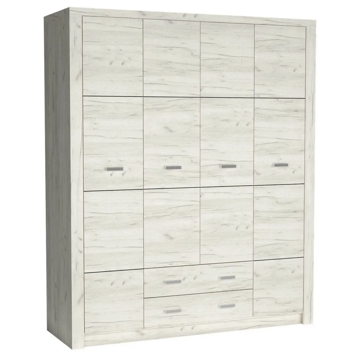 Duża szafa czterodrzwiowa ze srebrnymi uchwytami, pozwalająca dobrze zagospodarować przestrzeń w domu. Posiada pięć półek, które umożliwiają Ci układanie rzeczy, które wymagają położenia na płaską powierzchnię, oraz dwie pojemne szuflady, pozwalające na umieszczenie w szafie jeszcze większej ilości rzeczy. W meblu znajdują się również dwa drążki o długości 45,5 cm oraz jeden 77,6 cm, dzięki którym można powiesić rzeczy na wieszakach i dbać o organizację każdego ubrania.