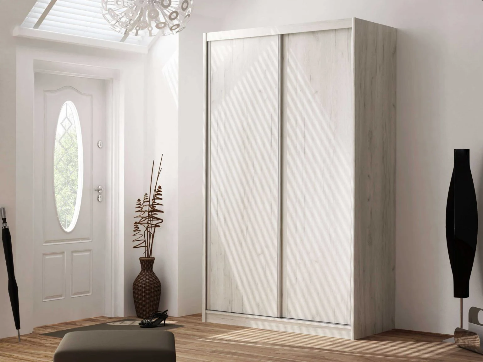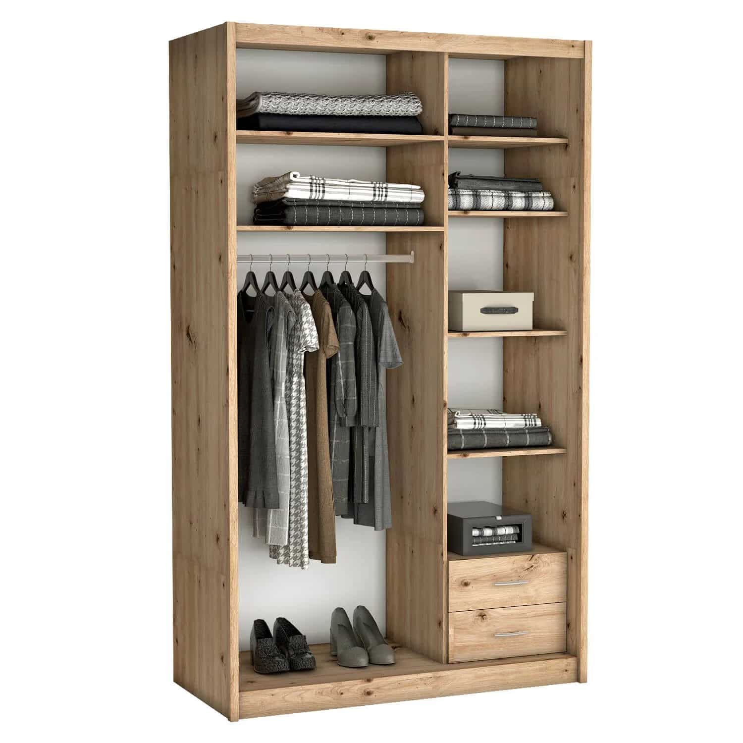 Ta szafa ma skrzydła drzwiowe, które płynnie przesuwają się na boki. Nowoczesne systemy przesuwne, wytrzymałe materiały oraz stonowana kolorystyka pozwoli tej szafie dyskretnie wtopić się w otoczenie innych mebli. Z powodzeniem może pełnić funkcję pojemnej garderoby, która odmieni otoczenie Twojej sypialni lub innego pomieszczenia.