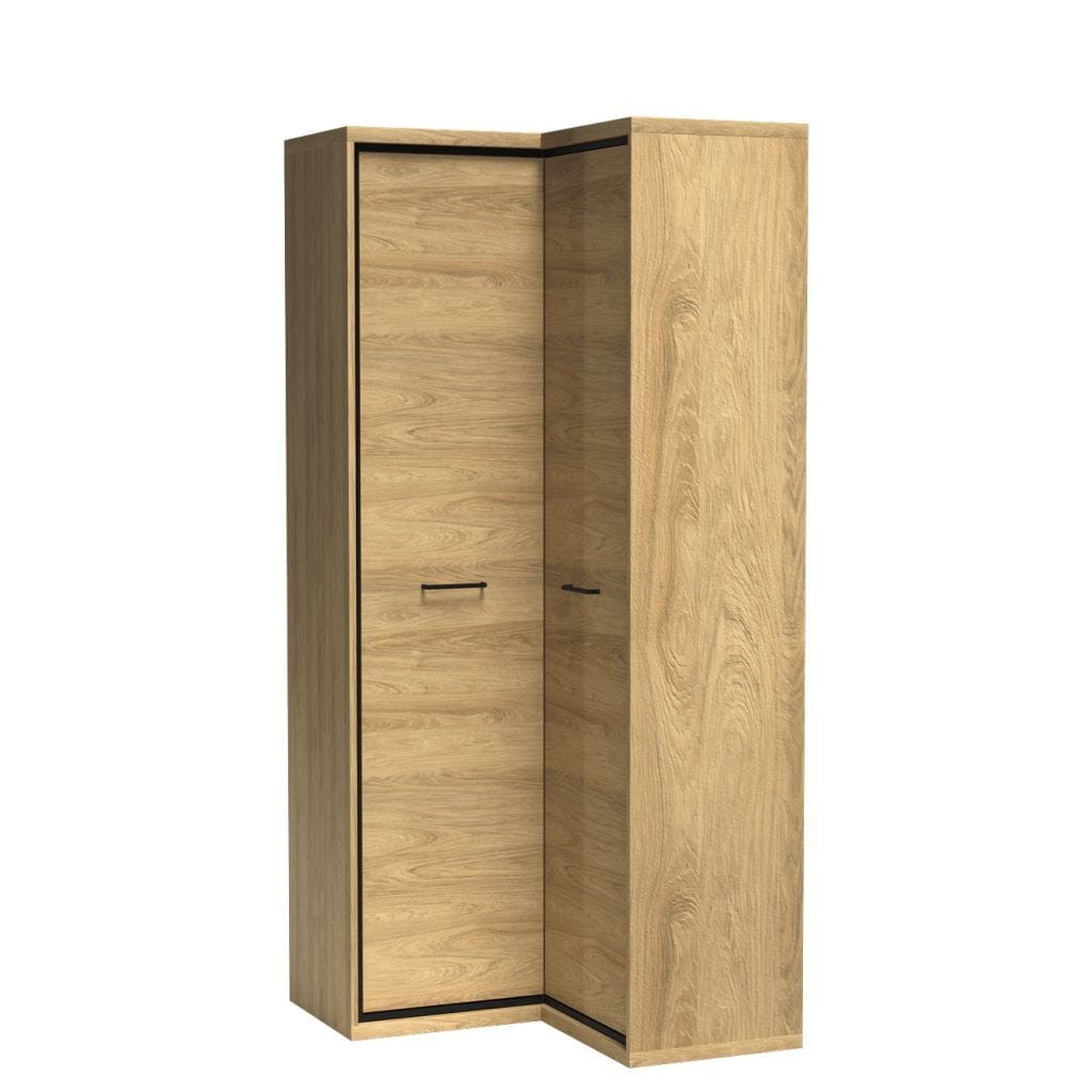 Narożna, pojemna szafa dwudrzwiowa z uchwytami do przechowywania ubrań. Dzięki opcji dodatkowych półek (opcja dodatkowo płatna) możemy zyskać mnóstwo miejsce. Rzadko spotykane rozwiązanie wśród szaf. Mebel w środku ma drążek do wieszania ubrań, a nad nim półkę.