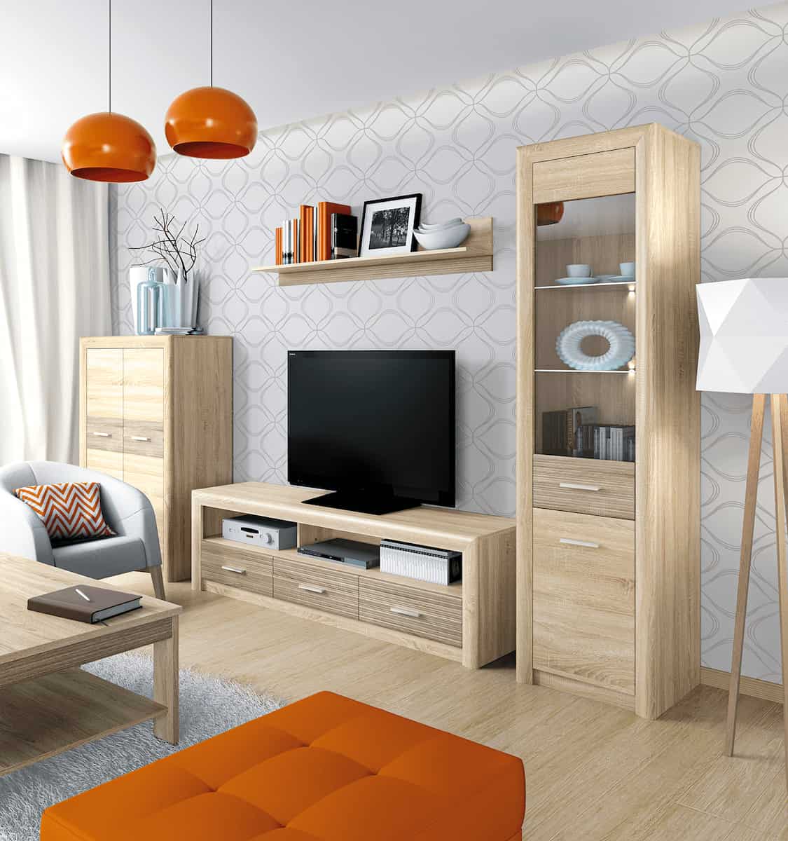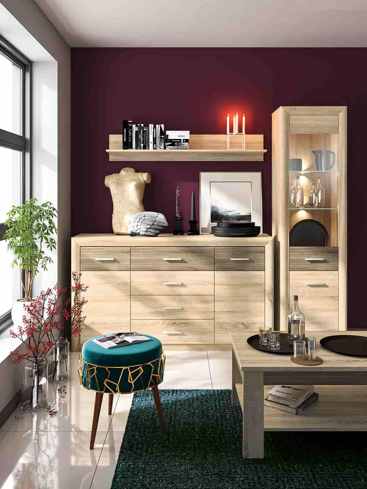 Kolekcja Castel została wykonana z płyty laminowanej o nowoczesnym kolorze jasnego Dębu sonoma, harmonijnie połączonego z ryflowaną wstawką MDF w odcieniu Dębu sonoma truflowa.